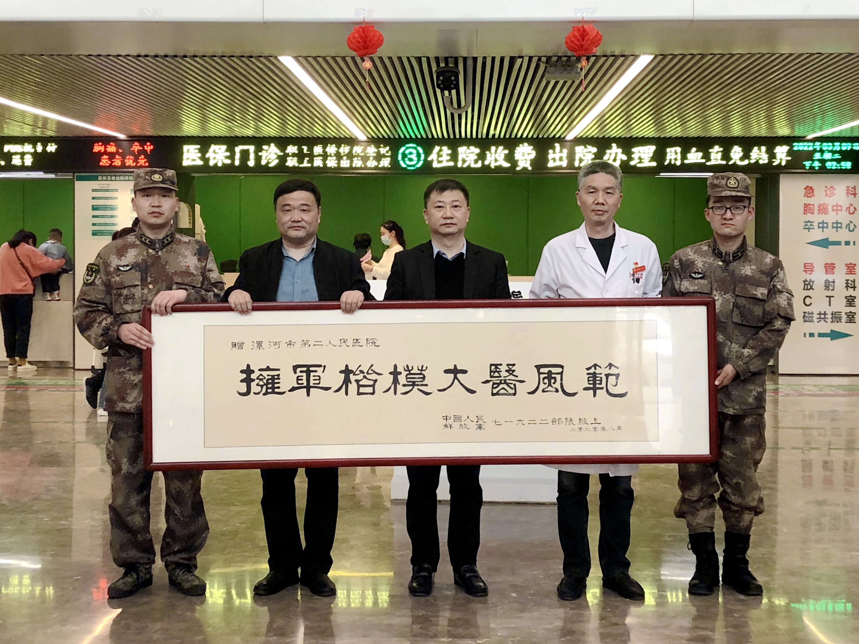 自2002年被民政部門確定為漯河市唯一一家擁軍優撫醫院以來,漯河市第二人民醫院始終不忘初心,高度重視擁軍優屬工作,不斷出臺措施,專門開通軍人、退役軍人就診綠色通道,為軍人和家屬提供全方位的保障和服務,對來院就診退役軍人、現役軍人及優撫對象給予相應的減免和優惠。同時,多次深入部隊、社區開展一系列義診、健康咨詢活動,為老退伍軍人送醫送藥、送棉衣被等專項關懷行動,受到了各級軍地領導和軍人軍屬的高度認可。醫院通過綠色通道,成功救治拉練中抽搐昏迷的現役軍人,部隊領導來院專程送來“擁軍楷模大醫風范”匾額,感謝市二院擁軍保障的工作實效。