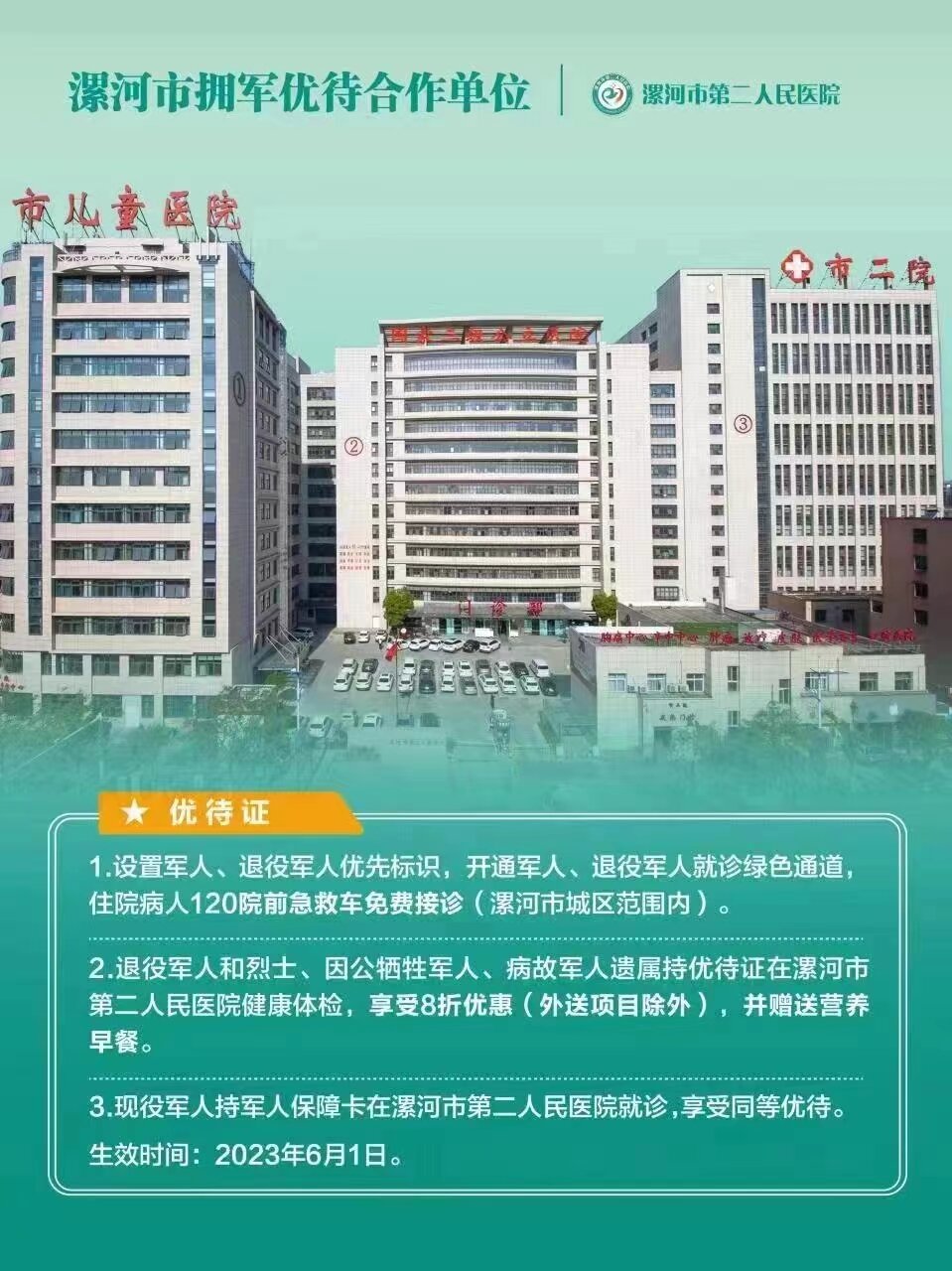 為進一步發揮在擁軍優撫事業中的積極作用,醫院進一步設置了軍人、退役軍人優先標識,開通軍人、退役軍人就診綠色通道,住院病人120院前急救車免費接診;退役軍人和烈士、因公犧牲軍人、病故軍人遺屬持優待證在漯河市第二人民醫院健康體檢,享受8折優惠,并贈送營養早餐?,F役軍人持軍人保障卡在該院就診,享受同等優待。