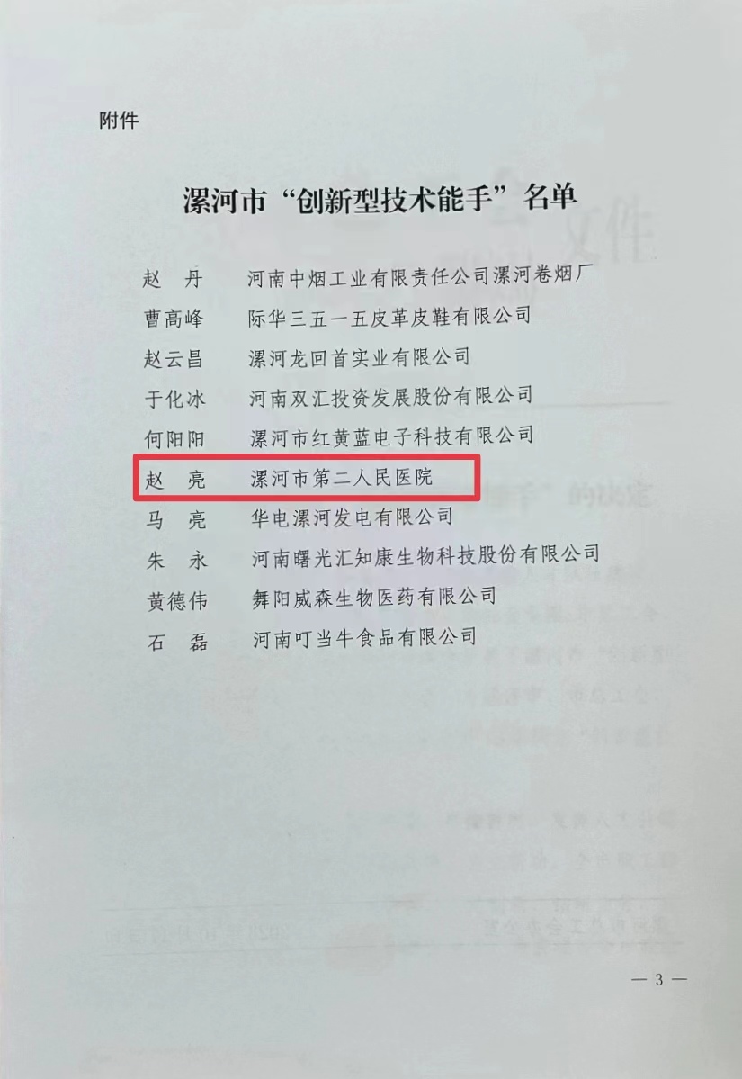 近日,漯河市人力資源局和社會(huì)保障局、漯河市總工會(huì)聯(lián)合印發(fā)《關(guān)于命名漯河市“創(chuàng)新型技術(shù)能手”的決定》(漯工文[2023]51號(hào)),經(jīng)過(guò)基層推薦、專(zhuān)家評(píng)審,全市10名同志受到表彰,其中市二院放療科副主任趙亮榮獲漯河市“創(chuàng)新型技術(shù)能手”稱(chēng)號(hào)。