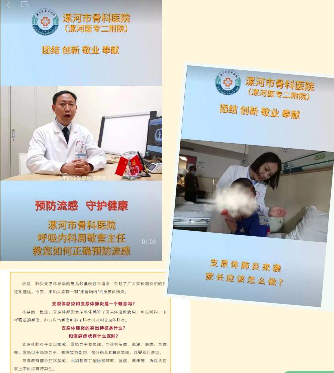 入秋以來呼吸道疾病高發,醫院結合日常工作經驗,不斷加強公眾教育和健康宣傳。邀請兒科、呼吸內科等科室的多位專家錄制科普視頻,并利用視頻號、抖音號等多平臺向公眾發布健康宣教知識。同時,向各科室征集健康科普文章,通過漯河市骨科醫院微信公眾平臺及省市級媒體進行發布,多渠道向公眾普及兒童常見疾病的預防和治療知識,為支原體肺炎的預防和應急處理提供支持,提高家長們的健康意識和應對能力。