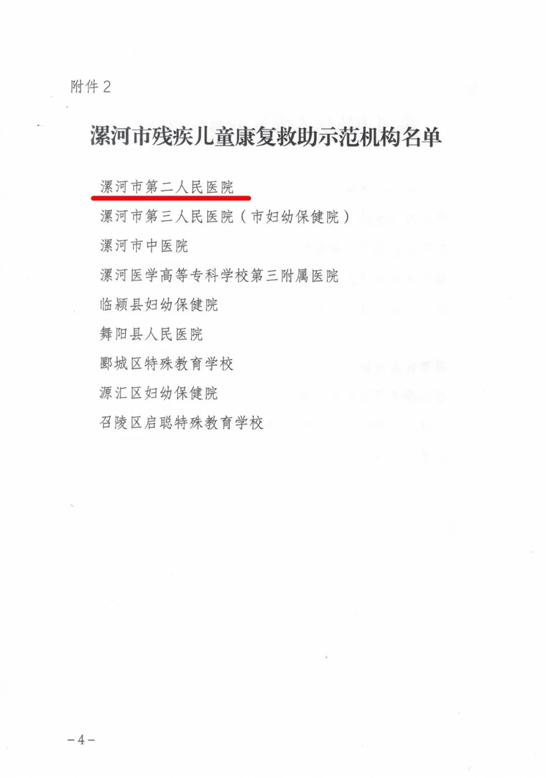 11月21日,根據《關于開展漯河市殘疾人康復示范點和殘疾兒童康復救助示范機構創建活動的通知》要求,經機構自薦申請、市殘聯復審等各環節工作,市二院被漯河市殘疾人聯合會命名為市殘疾兒童康復救助示范機構。