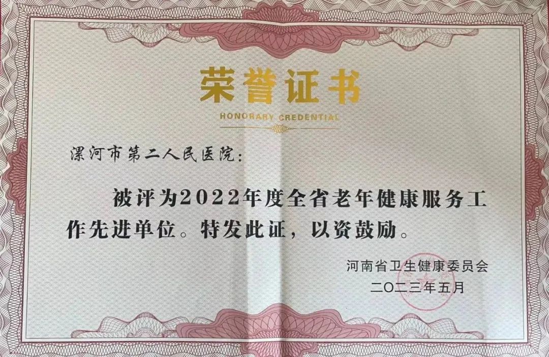 5月31日,河南省衛生健康委發布關于表彰2022年度全省老齡工作和老齡健康工作先進單位、先進個人的通報,市二院榮獲“2022年度全省老年健康服務工作先進單位”殊榮。