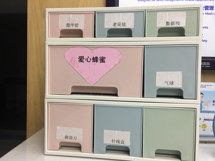 患者住院期間往往會(huì)因?yàn)榇颐θ朐夯蚴强紤]不周物品準(zhǔn)備的不齊全。比如,老年患者忘了戴花鏡,拿著各種報(bào)告單卻看不清,給住院生活帶來(lái)了不便;需要記錄電話號(hào)卻沒有紙和筆……這些住院患者日常生活中的不便之處,醫(yī)護(hù)人員都看在眼里,記在心上。原有的便民箱物品不能滿足患者需求,護(hù)士長(zhǎng)組織對(duì)全科護(hù)士、醫(yī)生、患者及家屬進(jìn)行調(diào)研,大家集思廣益,收集并整理了患者使用頻率高的物品,專門購(gòu)置了格子組合式的儲(chǔ)物箱來(lái)收納,患者可以根據(jù)自己的需求借用,解決患者和家屬的燃眉之急,為患者提供更加溫馨、舒適的住院環(huán)境,讓他們?cè)谖骞倏撇^(qū)感受到家的溫暖。
