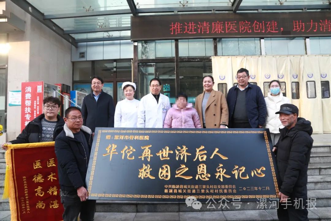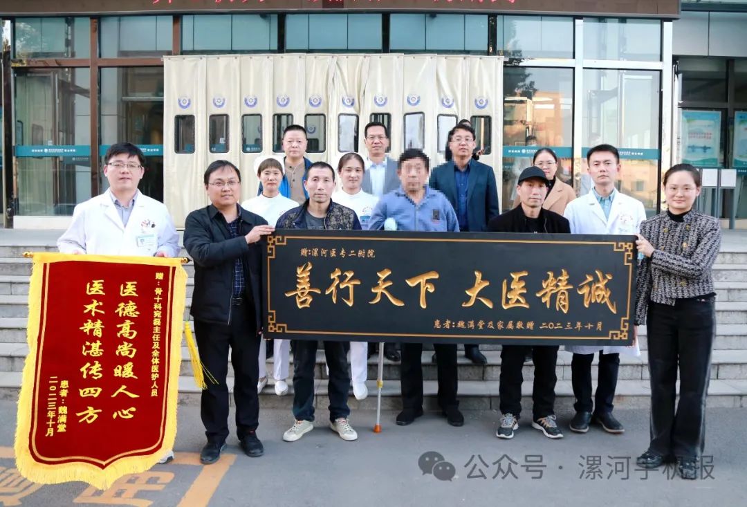 “華佗再世濟后人 救困之恩永記心”、“善行天下 大醫精誠”、“醫德高尚暖人心 醫術精湛傳四方”……連日來,臨潁縣、舞陽縣、召陵區的多位患者將一面面匾額、錦旗送到漯河市骨科醫院(漯河醫專二附院)的醫務人員手中,感謝醫院對他們開展的醫療救助和悉心治療。