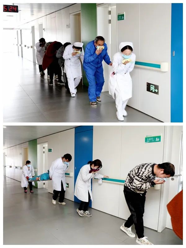 按照預案流程,醫院各救援小組緊急開展救援,科室醫護人員立即組織引導患者和家屬有序進行疏散撤離。對于不能行動的病人,醫護人員通過擔架迅速將其轉移至安全地帶。