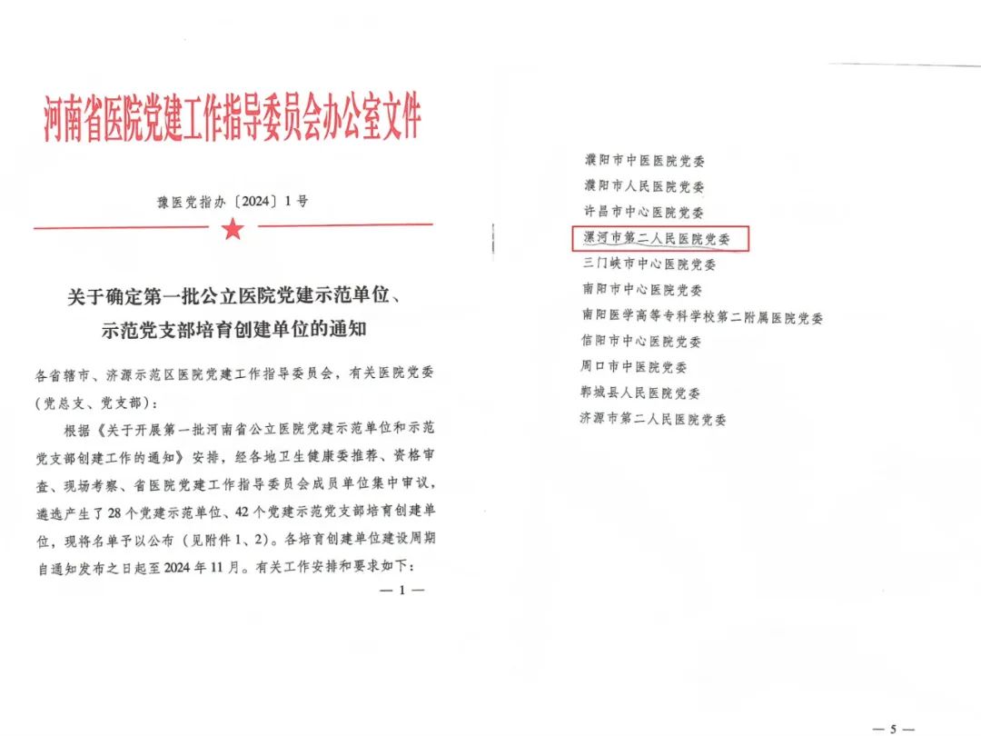 近日,河南省醫院黨建工作指導委員會下發《關于確定第一批公立醫院黨建示范單位、示范黨支部培育創建單位的通知》,市二院黨委被確定為河南省公立醫院黨建示范單位(培育創建單位),是全省28個黨建示范單位之一、漯河地區唯一。