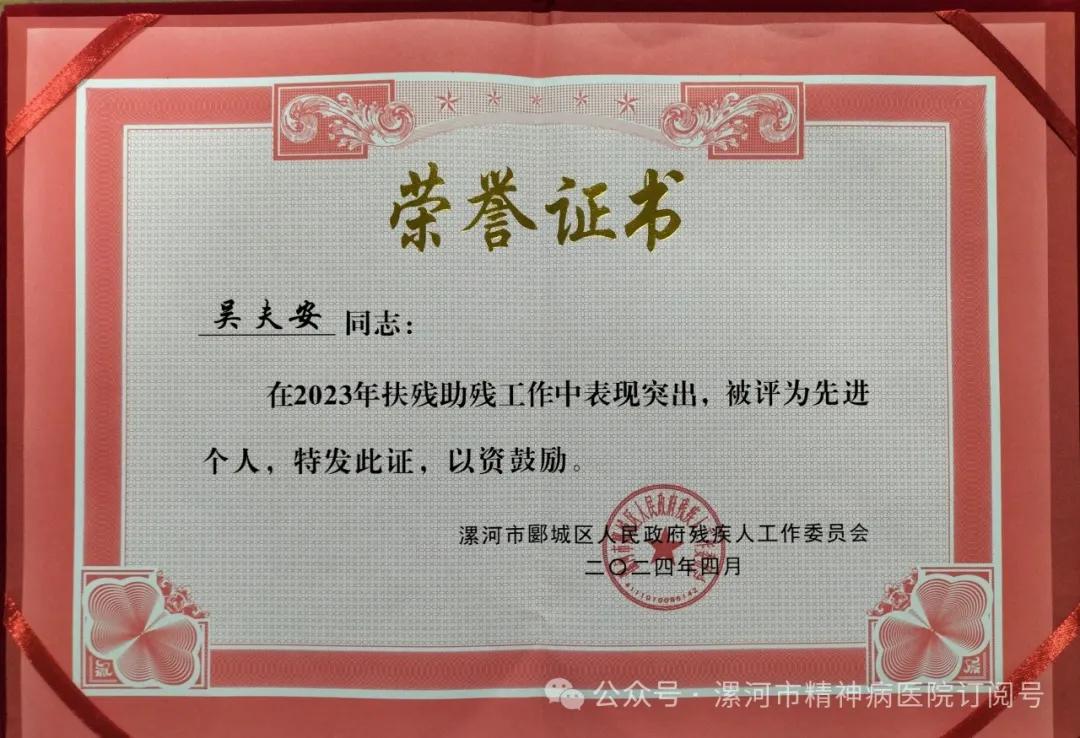 2024年4月24日上午,在漯河市郾城區殘聯“關于表彰2023年度全區殘疾人工作先進集體和先進個人”表彰會議中,漯河市精神病醫院獲得“2023年度扶殘助殘工作先進集體”,吳夫安同志在2023年度扶殘助殘工作中表現突出被評為“先進個人”榮譽稱號。