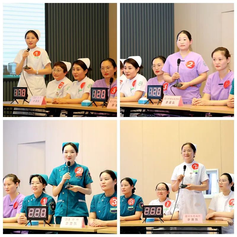 此次競賽內容涵蓋基礎護理、??谱o理、護理團體標準、核心制度、應急預案等專業知識,分為初賽和決賽。此次活動,共有25個護理單元75名選手參加,經過前期的層層選拔,8支代表隊24名選手參加了決賽。比賽現場氣氛火熱,高潮迭起,必答題環節各隊選手平分秋色,比分不相上下,隨著搶答環節的到來,比賽進入白熱化狀態,各隊選手快速思考,競相搶答,上演了一場精彩紛呈的腦力與速度的較量;在風險題環節,各隊選手不甘落后,幾乎是在題目出現的瞬間就已經有人按下了搶答器并給出準確的答案,體現他們扎實的理論知識和深厚的實踐功底。