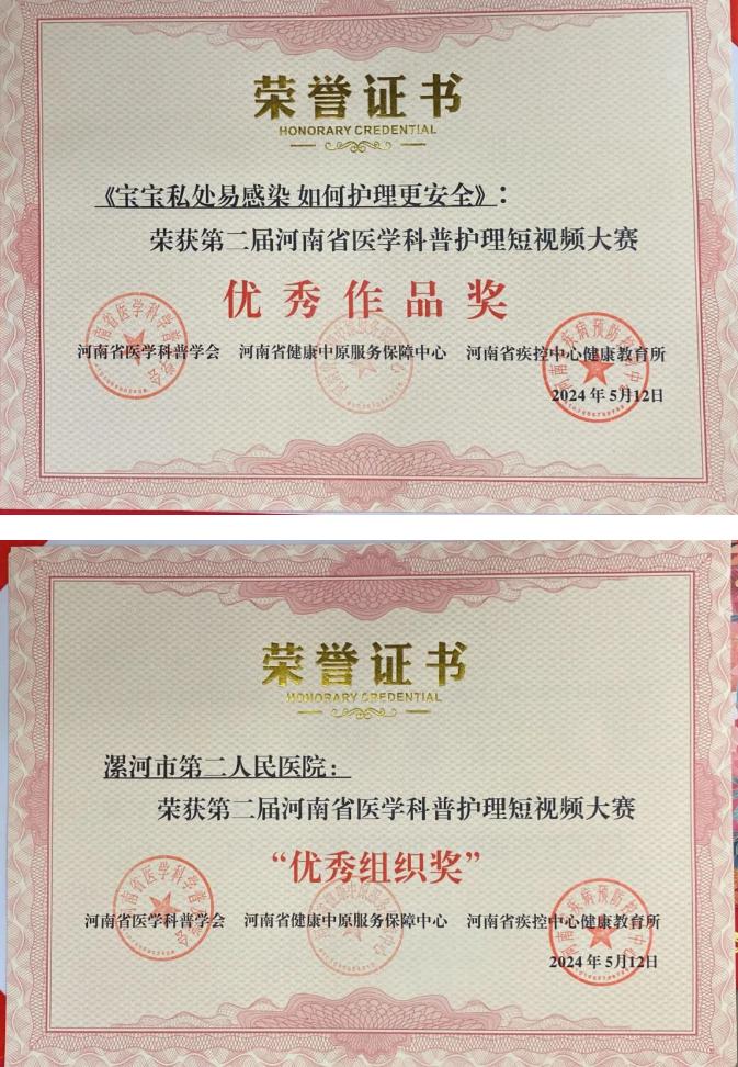 為慶祝113個國際護士節,展示護理工作者的美好職業形象,引導公眾樹立正確的心理健康理念,5月8日,由河南省衛生健康委宣傳處指導,河南省醫學科普學會、河南省健康中原服務保障中心及河南省疾病預防控制中心健康教育所主辦的“第二屆河南省醫學科普護理短視頻大賽”在鄭州落下帷幕。本次比賽,市二院黨委高度重視,號召全院職工積極參與,征集優秀護理科普短視頻,經過積極籌備,廣泛動員,共提交25部作品參賽。通過層層選拔,由張小玉、盧清麗、劉橋、王倩、陳星、劉曉燕護理團隊拍攝的科普視頻《寶寶私處易感染 如何護理更安全》從全省18個地市442家醫療機構2691部科普短視頻作品中脫穎而出,在本次大賽中榮獲優秀獎!同時醫院榮獲“優秀組織獎”!