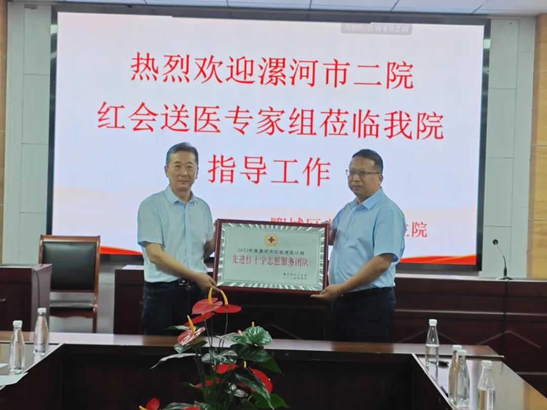 漯河市紅十字會黨組成員、副會長劉國防,市二院副院長張曉東,市二院工會主席李世學,郾城區紅十字會副會長李山峰,龍城鎮衛生院相關負責同志出席了本次對接會議和義診活動。對接會上,市紅會副會長劉國防對市二院“紅會送醫計劃”所做的工作表示了高度的肯定,并向醫院頒發了2023年河南省“紅會送醫計劃”先進單位、2023年漯河市“紅會送醫計劃”先進單位兩塊獎牌,對市二院李慧新等7名同志獲得省級和市級“優秀紅十字醫療專家志愿者”稱號表示祝賀。