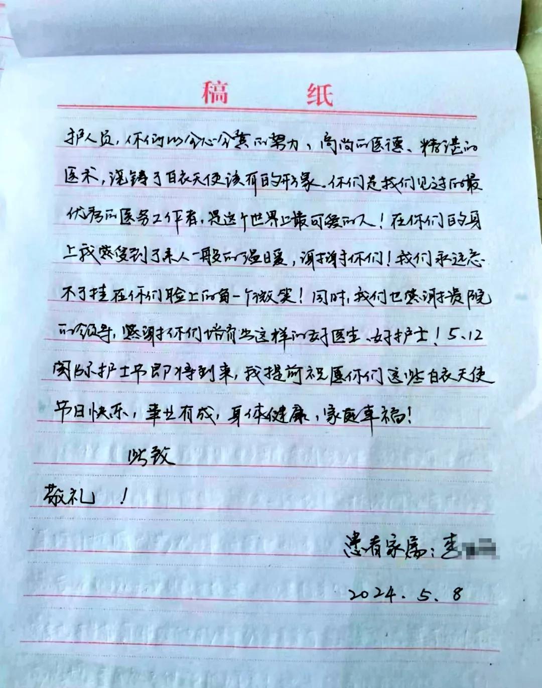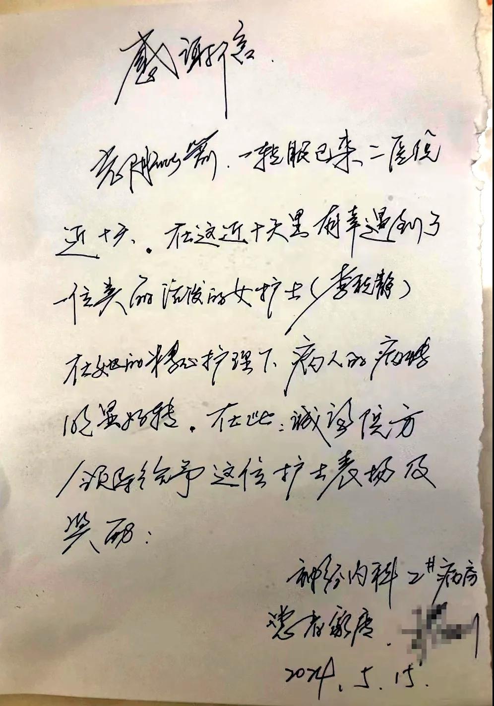 患者張女士長期受困于癱瘓狀態(tài),無法正常行走與進食,且伴有四肢肌張力異常增高的癥狀。在呂杰民主任與曹軍軍醫(yī)生共同制定的精確治療方案下,以及護理團隊持續(xù)、細致地照料,患者病情得到顯著改善。為感謝護士李秋靜在住院期間對患者提供的無微不至的關(guān)懷,5月15日,在即將出院之際,患者家屬將一封感謝信送到科室,以表達由衷的感激之情。