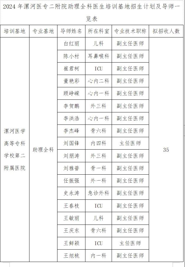 為深入貫徹落實《關于印發助理全科醫生培訓實施意見(試行)的通知》(國衛科教發〔2016〕14 號),根據《河南省衛生健康委關于做好2024年助理全科醫生培訓招收工作的通知》(豫衛科教函〔2024〕19號)要求,結合本院實際,現制定漯河醫學高等專科學校第二附屬醫院2024年助理全科醫生培訓招收方案如下: