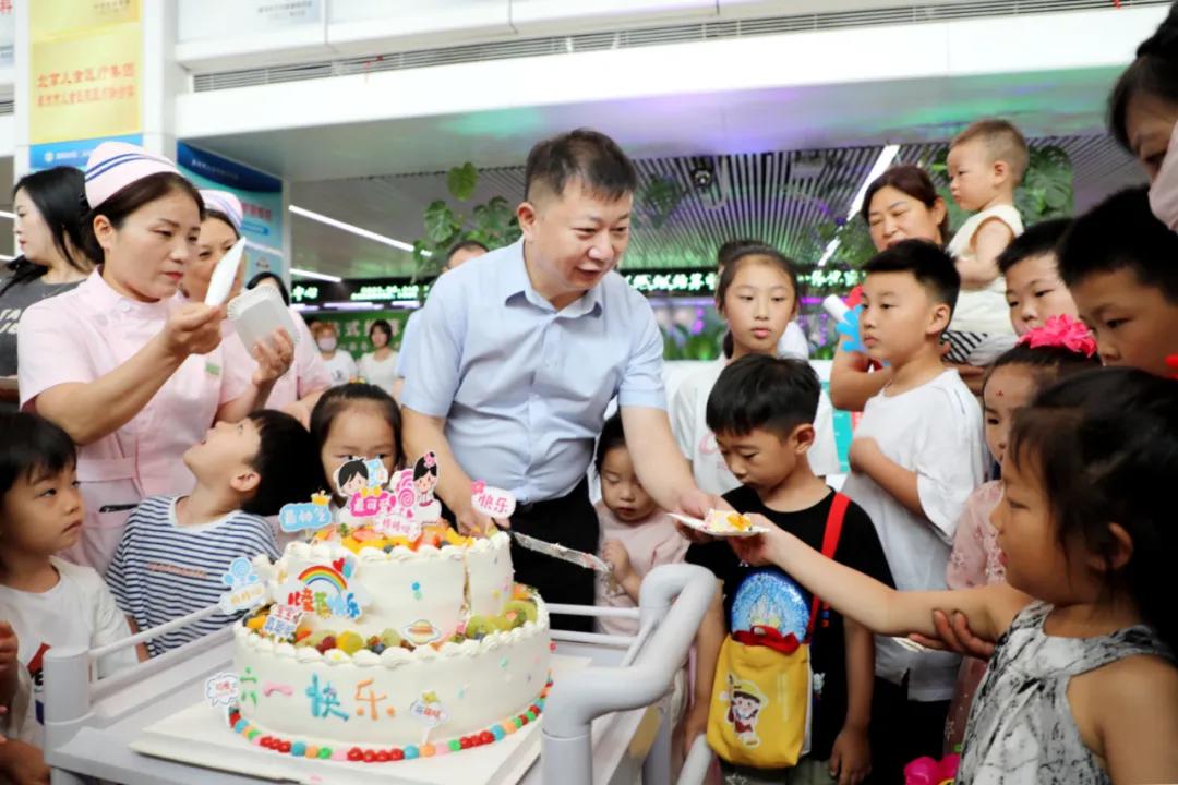 在門診大廳,黨委書記魏松、院長王瑾與兒科專家、護士長、孩子們一起切下節日蛋糕,并代表全院醫護人員對孩子們表示衷心的祝福,希望孩子們健康快樂成長。現場,醫護人員化身白雪公主、花仙子、小黃人、網紅青蛙與小朋友們熱情互動,友好交流,派發精心準備的節日禮物。