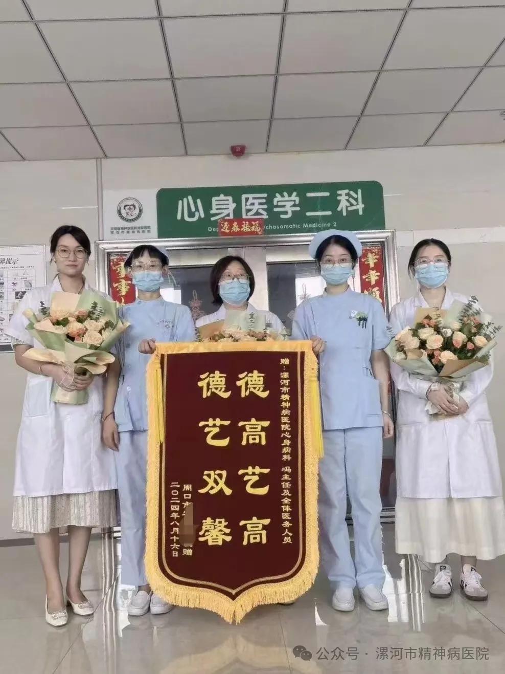 在醫(yī)師節(jié)當天,漯河市精神病醫(yī)院心身醫(yī)學二科收到了來自周口市患者—面繡著“德高藝高,德藝雙馨”的錦旗,為醫(yī)師節(jié)增添了一抹璀璨的光彩。