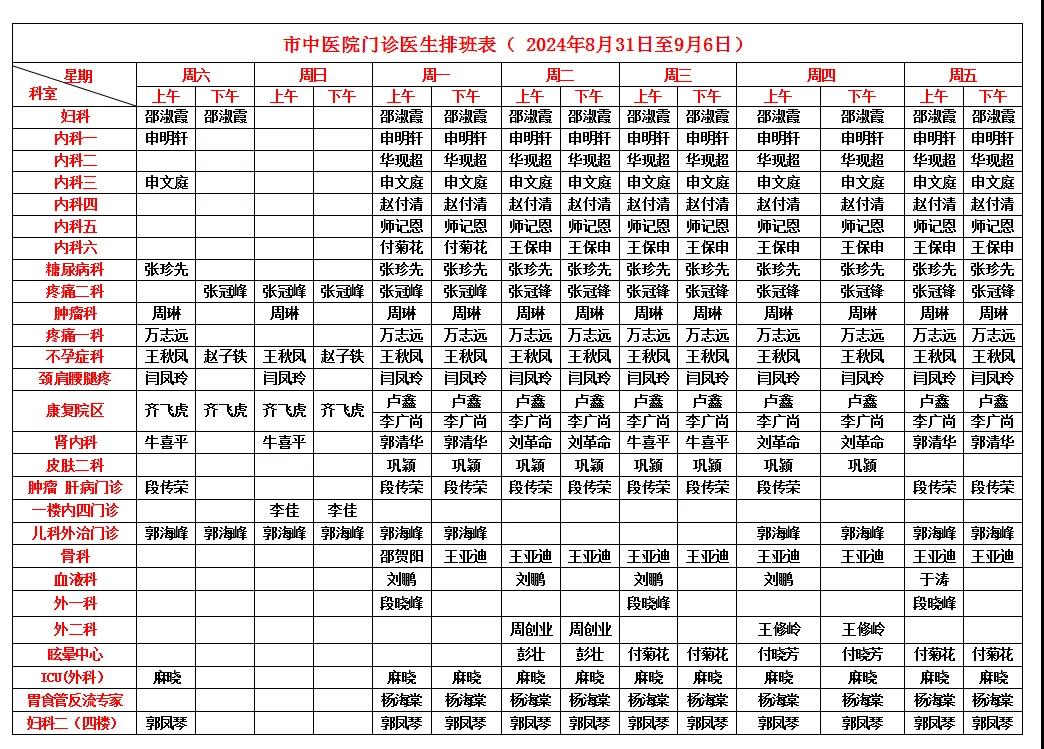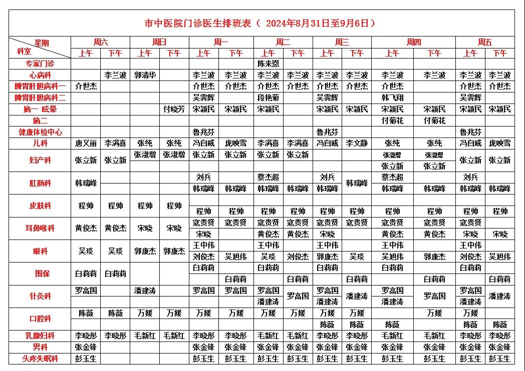 漯河市中醫院門診醫生排班表