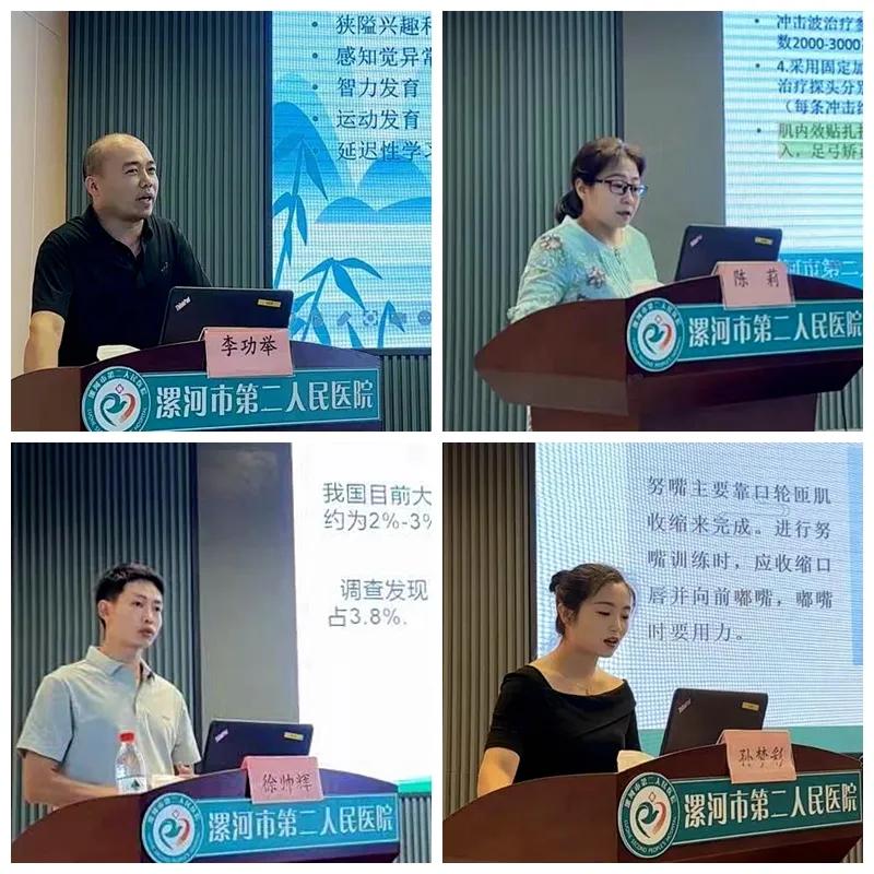 學術交流環節,河南省康復醫學會會長、河南省中醫院院長馮曉東、市二院中醫科主任朱青霞、市康復醫學會會長王海濤、市醫專三附院兒童康復科副主任李功舉、市二院中醫科副主任治療師陳莉、臨潁縣人民醫院康復科主管治療師徐帥輝、市二院中醫科康復治療師孫夢彩,分別就《銀發經濟與康復醫學發展》《急性神經根型頸椎病的綜合治療》《疼痛的康復評估和常用手法技術治療》《孤獨癥兒童情緒行為管理與教學策略》《脊柱側凸的診斷與治療》《沖擊波療法在疼痛疾病中的應用》《面癱的康復鍛煉》為題進行了全面細致地講解。