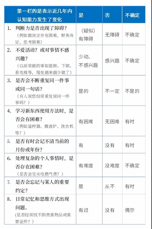 目前比較常用的是AD8癡呆篩查量表,它通過8個簡單的問題,快速評估是否有阿爾茨海默病風險。如果出現2個及以上的表現,則要及時到醫院就診咨詢,進一步明確診斷。 (殷旭芳)