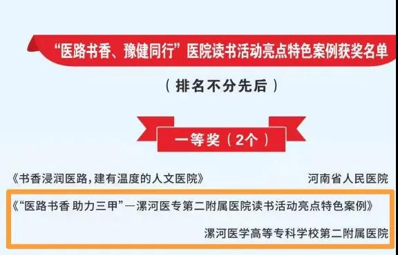 大會通報了系列活動優秀入圍作品名單,其中,漯河市骨科醫院(漯河醫專二附院、漯河市立醫院)報送的作品《醫路書香助力三甲》榮獲“醫路書香、豫健同行”醫院讀書活動亮點特色案例一等獎;《大醫吳廣良》榮獲“身邊的榜樣”敘事醫學故事一等獎;《黨建引領人文綜合服務能力提升》榮獲“員工關愛計劃”優秀案例!