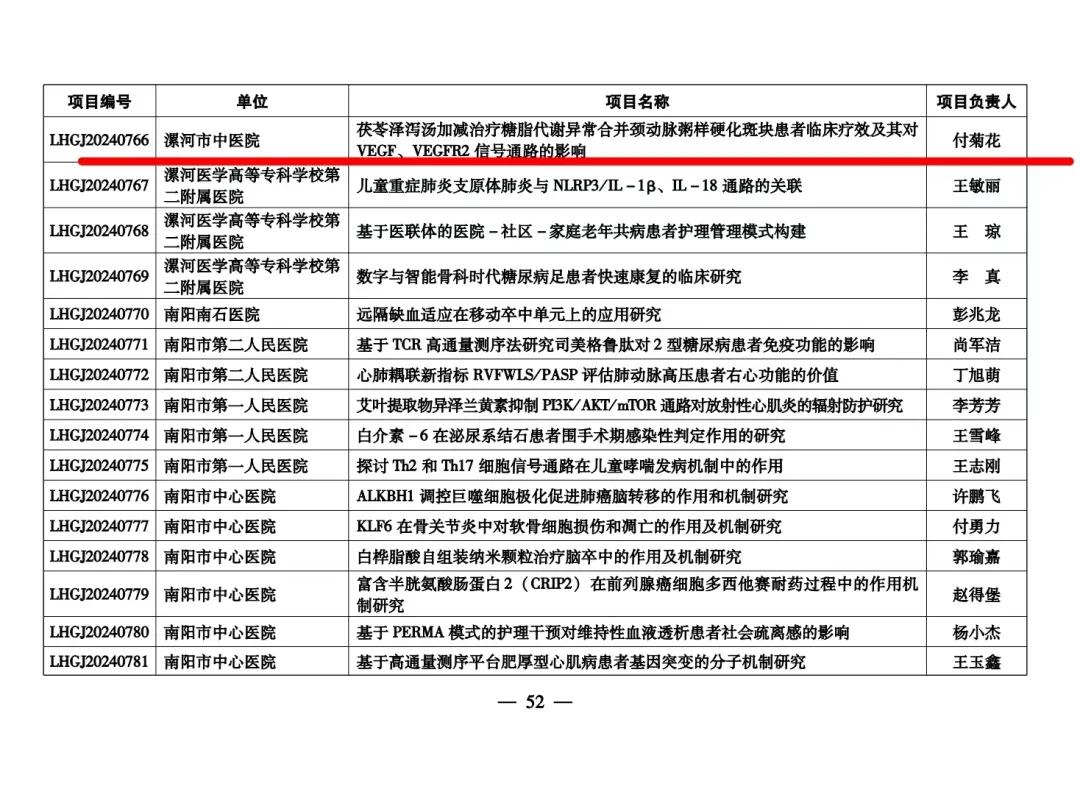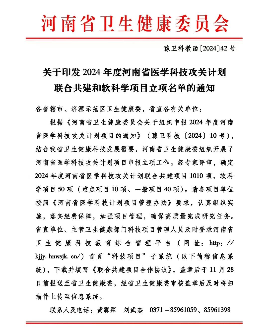 近日,河南省衛健委發布了《關于印發2024年度河南省醫學科技攻關計劃聯合共建和軟科學項目立項名單的通知》,漯河市中醫院作為主持單位,共有1個項目獲得立項,此次為醫院在該類項目申報中首次獲得立項,這是繼醫院博士創新實踐基地獲批以來,科技研發的又一新突破。