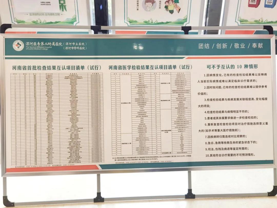 在門診大廳、檢驗大廳、簡易門診等就診區域和位點擺放了“河南省首批檢查結果互認項目清單”“河南省醫學檢驗結果互認項目清單”等詳細內容,持續加強宣教和講解,切實把好事辦好、實事辦實。