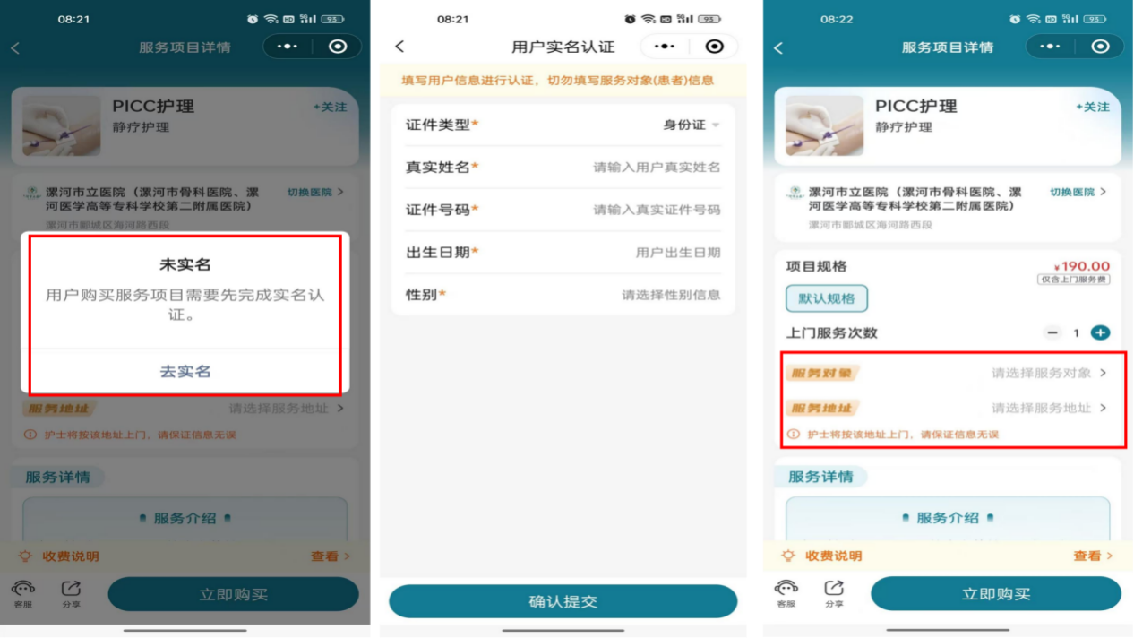 3.購買之后需實(shí)名認(rèn)證,請正確填寫各項(xiàng)信息,服務(wù)對象填寫的是需要被護(hù)理的患者,地址填寫準(zhǔn)確。