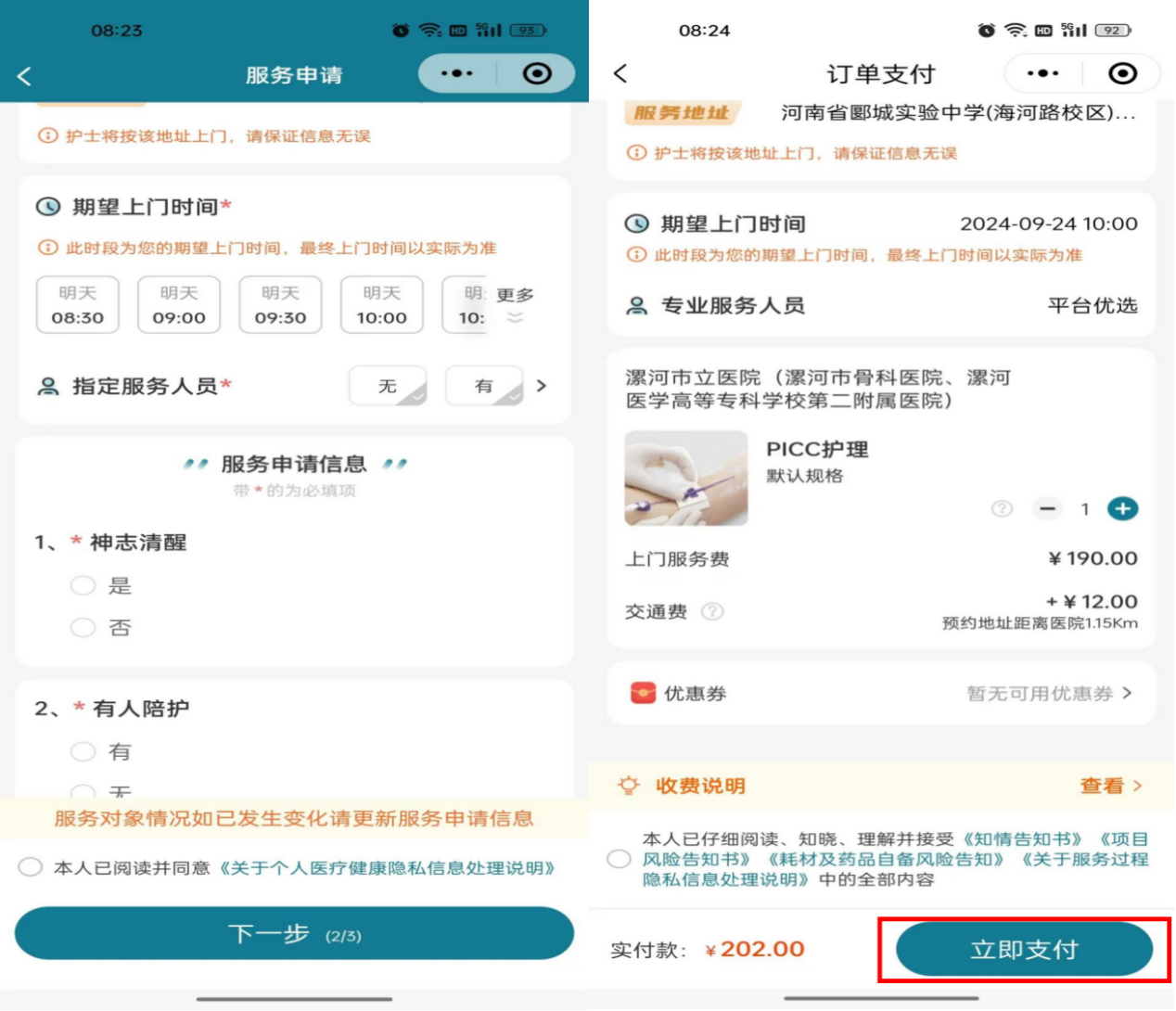 4.各項(xiàng)信息填寫后,支付訂單,護(hù)士接單后會與下單人電話聯(lián)系再次確認(rèn)。