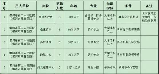 漯河市第二人民醫院(漯河市兒童醫院)因工作需要,需委托第三方以勞務派遣形式公開招聘醫保辦收費、臨床藥學、藥房調劑、靜配中心、病人服務中心等崗位人員共計23名,具體如下: