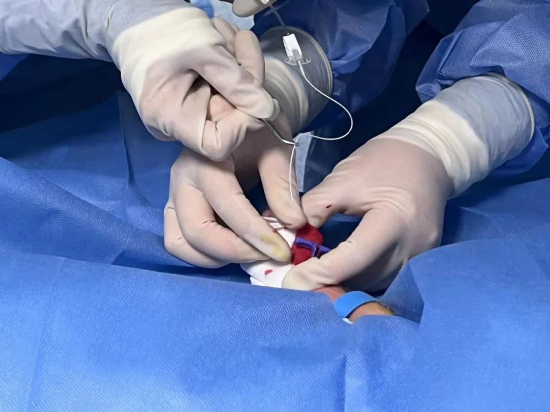 下午 16點(diǎn),在護(hù)理部副主任曹慧芳的指導(dǎo)下,兒科李紅護(hù)士長(zhǎng)與趙曙光精心進(jìn)行置管前準(zhǔn)備,血液凈化室呂春曉護(hù)士長(zhǎng)和腫瘤血液科于楊波護(hù)士長(zhǎng)全力協(xié)助,每一個(gè)細(xì)節(jié)都彰顯著團(tuán)隊(duì)的默契與協(xié)作。醫(yī)護(hù)人員全神貫注地為小天使進(jìn)行 PICC 置管穿刺。他們的每一個(gè)動(dòng)作都精準(zhǔn)而溫柔,仿佛在雕琢一件稀世珍寶,因?yàn)槲覀兩钪@是守護(hù)新生命的關(guān)鍵一步。