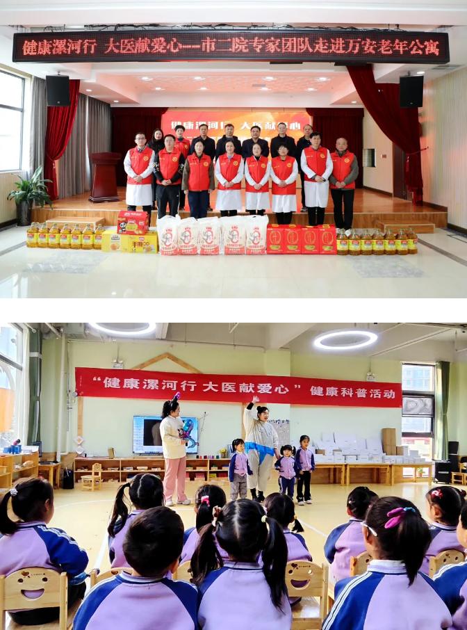 根據市衛健委工作安排,12月26日上午,市二院黨委書記魏松、紀委書記孟德陽、副院長劉橋,帶領專家志愿者團隊走進“花千樹”幼兒園和萬安醫院開展“健康漯河行 大醫獻愛心”系列科普、義診活動。