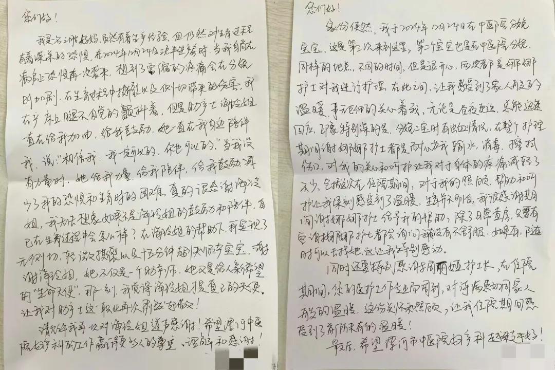 手寫的感謝信表達了對護士長周麗婭暖心細致的全程護理服務,助產士朱海玲專業的助產技術及心理支持,助力寶寶平安生產以及謝娜娜護士耐心細致的護理和陪伴,讓她十分感動,住院期間感受到了家的溫暖和如親人般的陪伴。這些都如涓涓細流滋潤著寶媽和家屬的心田,并以寫信的方式表達對婦產科團隊優質護理服務的認可。