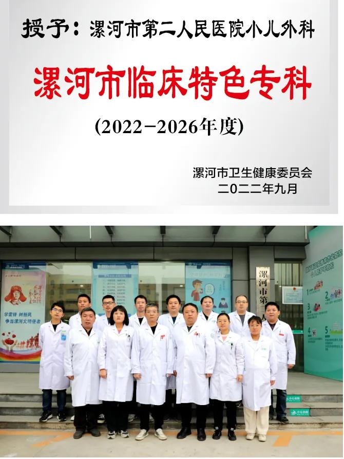 漯河市第二人民醫院小兒外科為河南省小兒外科專業聯盟單位、鄭大一附院河南省小兒外科疑難重癥診治聯盟單位,設床位50張,現有主任醫師1人,副主任醫師2人,主治醫師3人,醫師2人,科室擁有全套德國高清小兒腹腔鏡、胸腔鏡等眾多先進設備,率先在我市開展小兒腹腔鏡、胸腔鏡等微創手術,主要診治各先天性腸閉鎖、先天性胃破裂、肛門閉鎖、急性闌尾炎、梅克爾憩室、小兒疝氣、小兒包皮過長及包莖、腸息肉、腸套疊、兒童膿胸、氣胸等疾病,尤其擅長小兒胸腹腔鏡治療。在醫院的大力支持下,小兒外科不斷應用多項診療新技術,為眾多患兒解除病痛,特別在新生兒及小兒外科高難度微創手術等領域有著獨特的優勢。