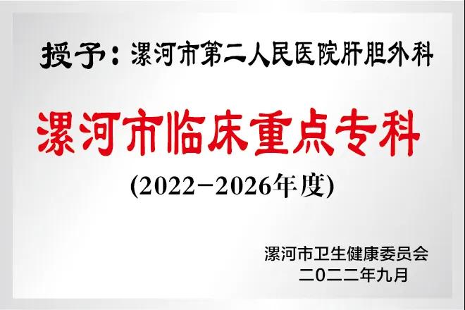 漯河市第二人民醫院普外科含肝膽外科、燒傷科、泌尿外科、微創外科、普外科。其中肝膽外科為漯河市醫學重點專科,擁有普通病床46張,重癥監護病床5張,該科技術力量雄厚,現有主任醫師3人,副主任醫師2人,住院醫師3人,副主任護師1人,其中碩士研究生2名。科室先后榮獲河南省衛生廳科技成果獎4項,漯河市科技成果獎30余項,其中一等獎8項。分別和火箭軍總醫院、上海東方肝膽外科醫院、河南省人民醫院肝膽外科等建立診療聯盟單位,定期邀請知名專家來院義診及手術,能為漯河市及周邊地區的病人提供優質的醫療服務。