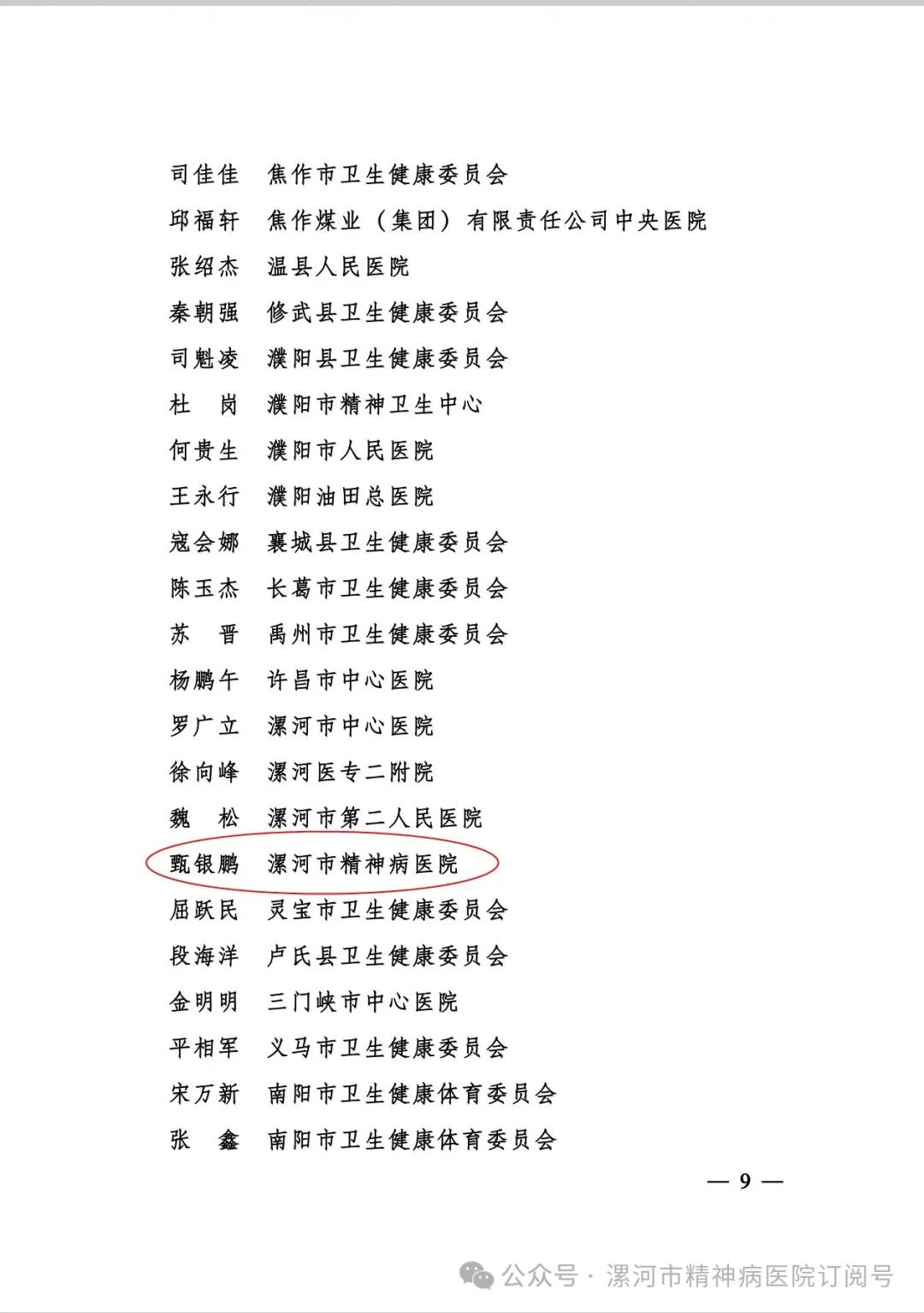 近日河南省健康委員會關于表揚2024年度全省醫政和護理工作表現突出集體和個人的通報中,漯河市精神病醫院醫務科科長甄銀鵬榮獲“全省醫政工作表現突出個人”