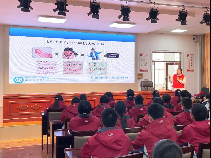 活動現場,市二院兒童保健科副主任李錦璐就《生活中長高的秘訣》,特別強調了身體健康的重要性,詳細介紹了兒童身高發育的成因、危害以及預防措施。引導同學們樹立正確的飲食觀念,鼓勵大家多參與戶外活動,保持健康的生活方式;副主任醫師郭鳳仙圍繞《青少年心理健康》針對心理行為異常問題,以通俗易懂的語言幫助同學們正確認識青春期可能出現的心理變化,引導大家學會積極應對學習和生活中的壓力與挑戰,保持樂觀向上的心態。