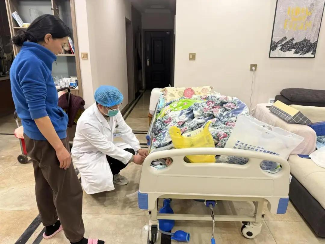 陳笑寒耐心地安撫家屬的情緒,同時迅速指導他們在豫健護理到家平臺上進行下單。訂單一經接收,在閆衛甫主任的全力支持下,她與醫生劉明啟迅速響應,僅用數分鐘便仔細核對并打包了所有必需品。盡管一天的勞累尚未消散,他們還是不顧疲憊,迎著暮色急忙趕往患者家中。