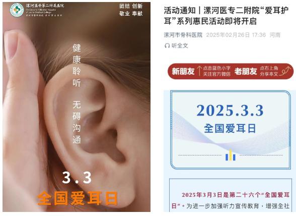 3月3日是第26個全國“愛耳日” ,為進一步普及聽力健康科學知識,增強全社會聽力殘疾預防意識和預防能力,漯河醫專二附院(漯河市骨科醫院、漯河市立醫院)耳鼻咽喉科牽頭開展了一系列內容豐富、形式多樣的愛耳日宣傳教育活動。
