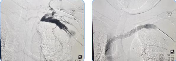 腎內科接診醫生對其進行查體后,判斷其中心靜脈存在問題,建議進行手術治療。在完善術前檢查后,腎內科團隊的成功對患者實施了左側無名靜脈覆膜支架置入術。此次手術歷時1小時,在DSA(數字減影血管造影)引導下成功于患者左側無名靜脈閉塞處植入支架,術后患者上肢腫脹癥狀即刻緩解,次日即恢復正常透析。