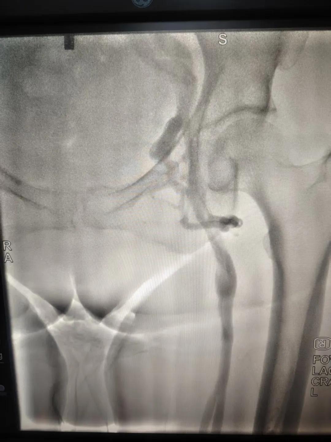 該患者,中年女性,左下肢反復腫脹、疼痛多年就醫,未明病因。門診就診,經血管外科副主任周創業評估病情后,為該患者門診行下肢靜脈造影,造影結果示:左髂靜脈周圍側枝形成,左髂靜脈壓迫綜合癥。明確診斷后將擇期介入手術治療。