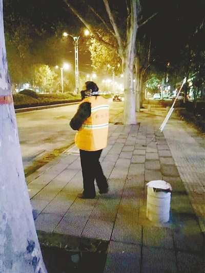 記者通過(guò)網(wǎng)友“馮馮馮馮馮好聽(tīng)啊”聯(lián)系到拍攝這組照片的網(wǎng)友“微微的微笑”。她告訴記者:“11月26日晚上9點(diǎn)左右,我經(jīng)過(guò)市區(qū)黃河路與舟山路交叉口附近時(shí),看到這位環(huán)衛(wèi)工人,就拍了幾張照片。”