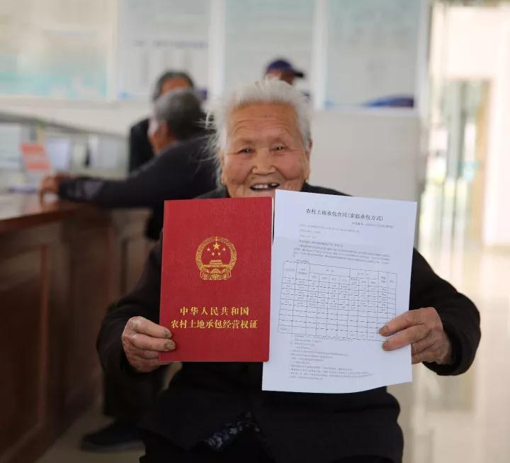 △2017年4月5日,江蘇省海安縣南莫鎮唐莊村1組村民丁桂英喜領《農村土地承包經營權證》。