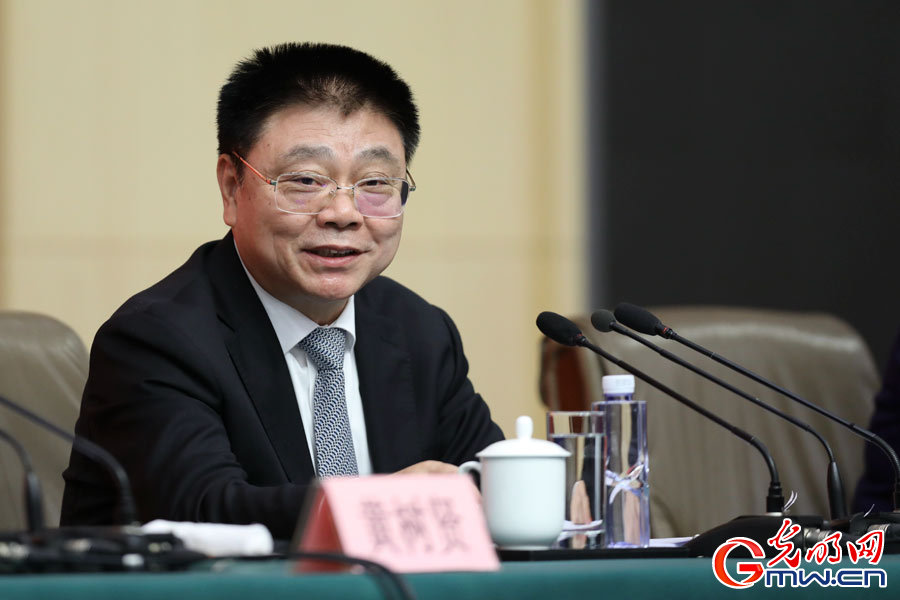 民政部黨組書記、部長黃樹賢回答記者提問。 (光明網記者 孫佳涵/攝)