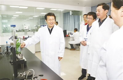 4月22日,市委書(shū)記蒿慧杰在國(guó)家肉制品檢測(cè)中心調(diào)研指導(dǎo)。記者 王慶建 攝