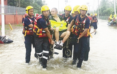 7月21日上午11時(shí)許,在安徽省六安市裕安區(qū)固鎮(zhèn)的一個(gè)衛(wèi)生院內(nèi),洪水漫過(guò)院子不斷涌進(jìn)樓內(nèi),造成大量病人被困。張洋博和隊(duì)友在三樓一個(gè)角落處搜救時(shí),發(fā)現(xiàn)一名老人癱瘓?jiān)诖病>o急情況下,在確保老人身體無(wú)恙之后,張洋博和隊(duì)友將老人抬上輪椅,將老人轉(zhuǎn)移到安全地帶。