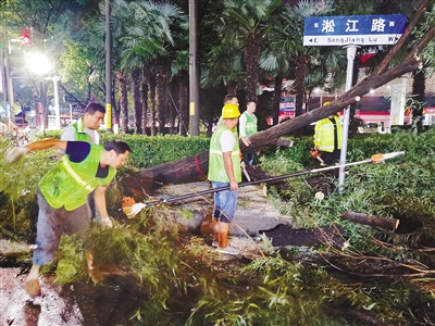 18日晚上10點(diǎn),市城管局園林綠化養(yǎng)護(hù)中心對淞江路與泰山路交叉口的倒伏樹木進(jìn)行清理。