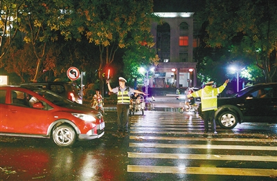 強(qiáng)降雨導(dǎo)致交通擁堵,交警也延長了執(zhí)勤時(shí)間。圖為18日晚上9點(diǎn),洪河路與嵩山路交叉口,交警在路上疏導(dǎo)交通。