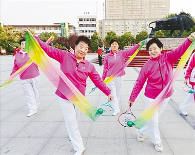 10月23日,龍塔街道太行山路社區組織轄區老人在黃河廣場開展重陽節柔力球健身活動。