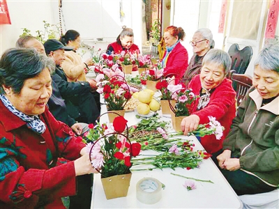 10月23日,源匯區東大街社區組織轄區老人開展重陽節插花活動。
