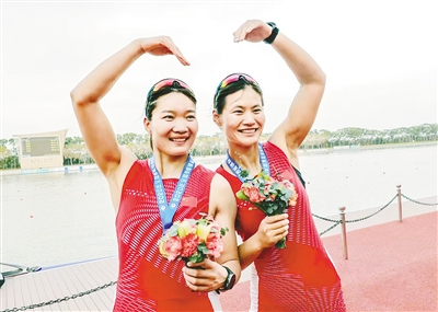 呂揚(右)與隊友張靈拿下2020年全國賽艇錦標賽首金。