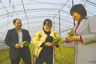 胡會玲(中)在自家大棚里看著長勢良好的蔬菜,喜悅之情溢于言表。