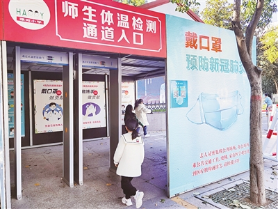 漯河小學門口,學生通過體溫檢測通道進入校園。